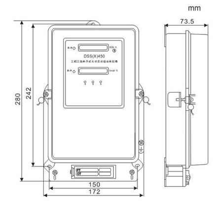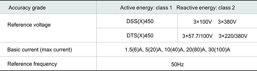DT/SS(X)450 series three-phase electronic combination watt-hour meter for active and reactive energy adopts ultra-low power consumption large-scale integrative circuit technology as well as SMT technology, it presents high reliability and long service life, can measure active energy and reactive energy at three-phase power grid of reference frequency 50Hz correctly, each technical index of product conforms to requirements for three-phase static watt-hour meters for active and reactive energy stipulated in standards GB/T 17215.321-2008 and GB/T 17882-1999.
