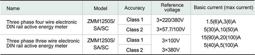 Model ?ZMM1250S ?three ?phase ?electronic?DIN rail active energy meter is a kind of new style?three phase four wire active energy meter, it adopts?micro-electronics technique, and imported large scale?integrate circuit, use advanced technique of digital?and SMT techniques, etc. The meter completely?accords with relevant technical requirements of?class 1 three phase active energy meter stipulated?in international standard IEC 62053-21. It can?accurately and ?directly measure 50Hz or 60Hz active?energy consumption from three phase four wire AC?electricity net. It can ?display total energy consumption?by step and motor type impulse register. It has following features: Good reliability, small volume, light weight, specious nice appearance, convenient installation, etc.