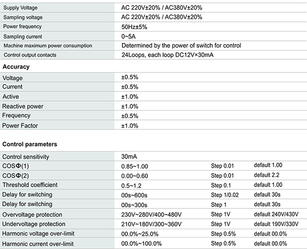 JKG-24 intelligent type reactive compensation controller adopted hi-speed digital signal processor, execute AC sampling. HMI is matrix 128x64 LCD, provided with supervision, reactive compensation, harmonic analysis, and adaptive freq calculation, the input signal change within 45Hz~55Hz.