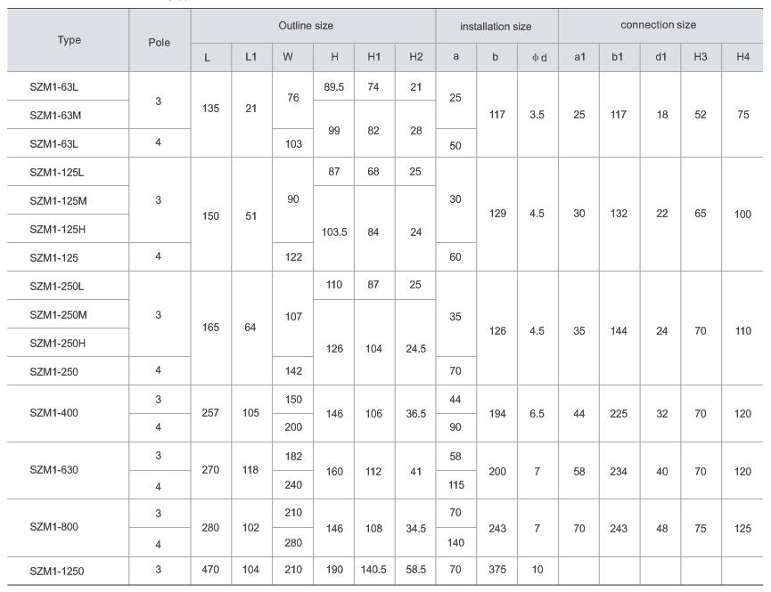 SZM1 series molded case circuit breaker (hereinafter referred to as circuit breaker) is suitable for distributingnetwork of AC 50Hz (or 60Hz), rated insulation voltage690V, rated working voltage 690V or below and ratedcurrent 1250A or below. It can be used to distributeelectric energy and protect the circuit and electricequipment against overload, short circuit and undervoltage, furthermore, the circuit breakers of framesize 400A below also can protect the motor againstoverload, under voltage and short circuit. Undernormal condition, the circuit breaker also can be usedto switch the circuit and start the motor infrequently. The products are in conformity with such standards as IEC 60947-2 and GB 14048.2.