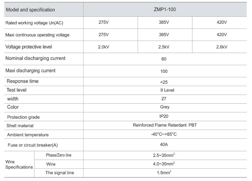 ZMP1-100 series surge protective device (hereinafter called SPD) is suit-able for the IT, TT, TN-C, TN-S, TN-C-S and etc power supply system of AC 50/60Hz, rated voltage 400V and below, to rotect from direct and indirect lightning impulse and other transient over voltage.