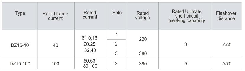 DZ15 series molded case circuit breaker (hereinafterreferred to as circuit breaker) is suitable for circuit ofAC 50Hz, rated voltage 380V, rated current 100A, usedto distribute electric energy and protect the circuit andmotor against over load and short circuit, it also canbe used to switch circuit and start motor infrequently. The products are in conformity with such standardsas GB 14048.2, GB 14048.4, IEC 60947-2 and IEC 60947-4.