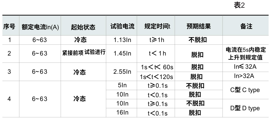 注:a. 5A, 10A, 20A, 50A, 100A, 200A, 500A的試驗(yàn)僅對(duì)驗(yàn)證動(dòng)作時(shí)進(jìn)行,對(duì)大于過(guò)電流瞬時(shí)脫扣范圍下限的電流值不進(jìn)行試驗(yàn)。