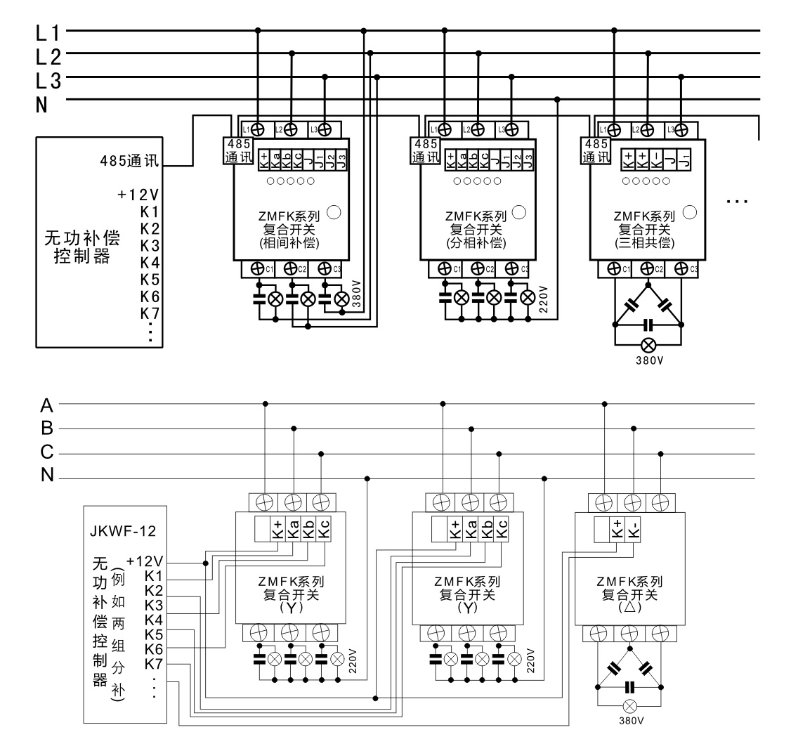 注:有1組相同補(bǔ)償和有1組分相補(bǔ)償,后面都是共補(bǔ)得接線如上圖;圖中的K+連接動態(tài)無功補(bǔ)償控制器的+12V端子;