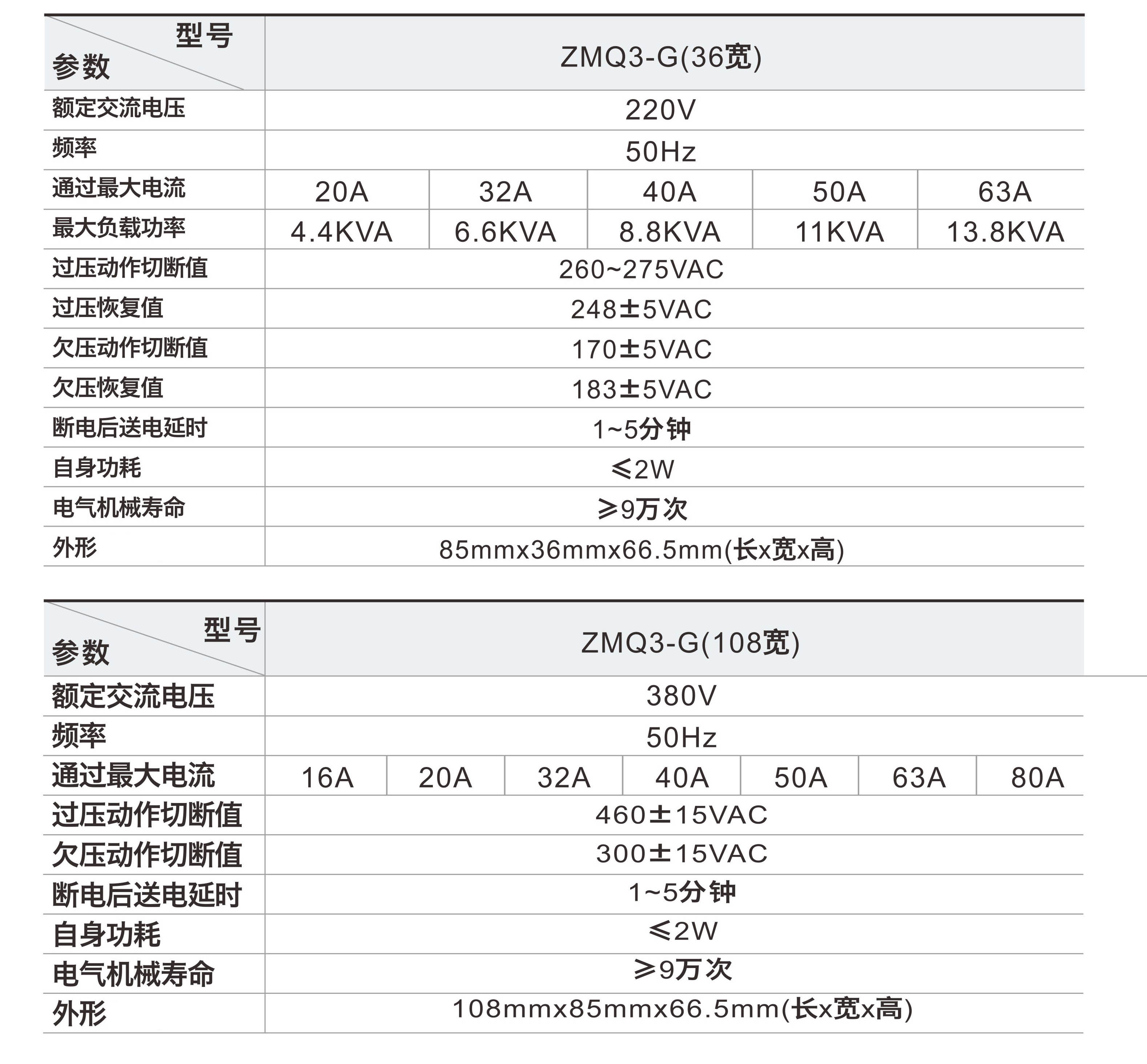 ZMQ3-G自復(fù)式過(guò)欠壓延時(shí)保護(hù)器是我公司分根據(jù)目前市電狀況所研制的新一代家電保護(hù)裝置,控制線路選用進(jìn)口元器件組裝,產(chǎn)品用模數(shù)化標(biāo)準(zhǔn)生產(chǎn),性能優(yōu)良、可靠。能在電壓異常情況下正常工作。當(dāng)市電電壓超過(guò)保護(hù)器動(dòng)作電壓時(shí),保護(hù)器能迅速、可靠地切斷電源,以達(dá)到保護(hù)電器安全。當(dāng)市電電壓恢復(fù)正常時(shí),保護(hù)器能自動(dòng)接通電源、恢復(fù)供電,所有功能全部自動(dòng)實(shí)施、無(wú)需人員操作。面板上的發(fā)光二極轉(zhuǎn)能指示保護(hù)器工狀況。指示燈發(fā)綠光是工作電壓指示,指示燈紅燈不亮?xí)r正常供電,紅燈亮?xí)r保護(hù)功能啟動(dòng)切斷供電。本系列產(chǎn)品結(jié)構(gòu)緊湊、外觀美觀、安裝與DZ47(C45)導(dǎo)軌通用。
