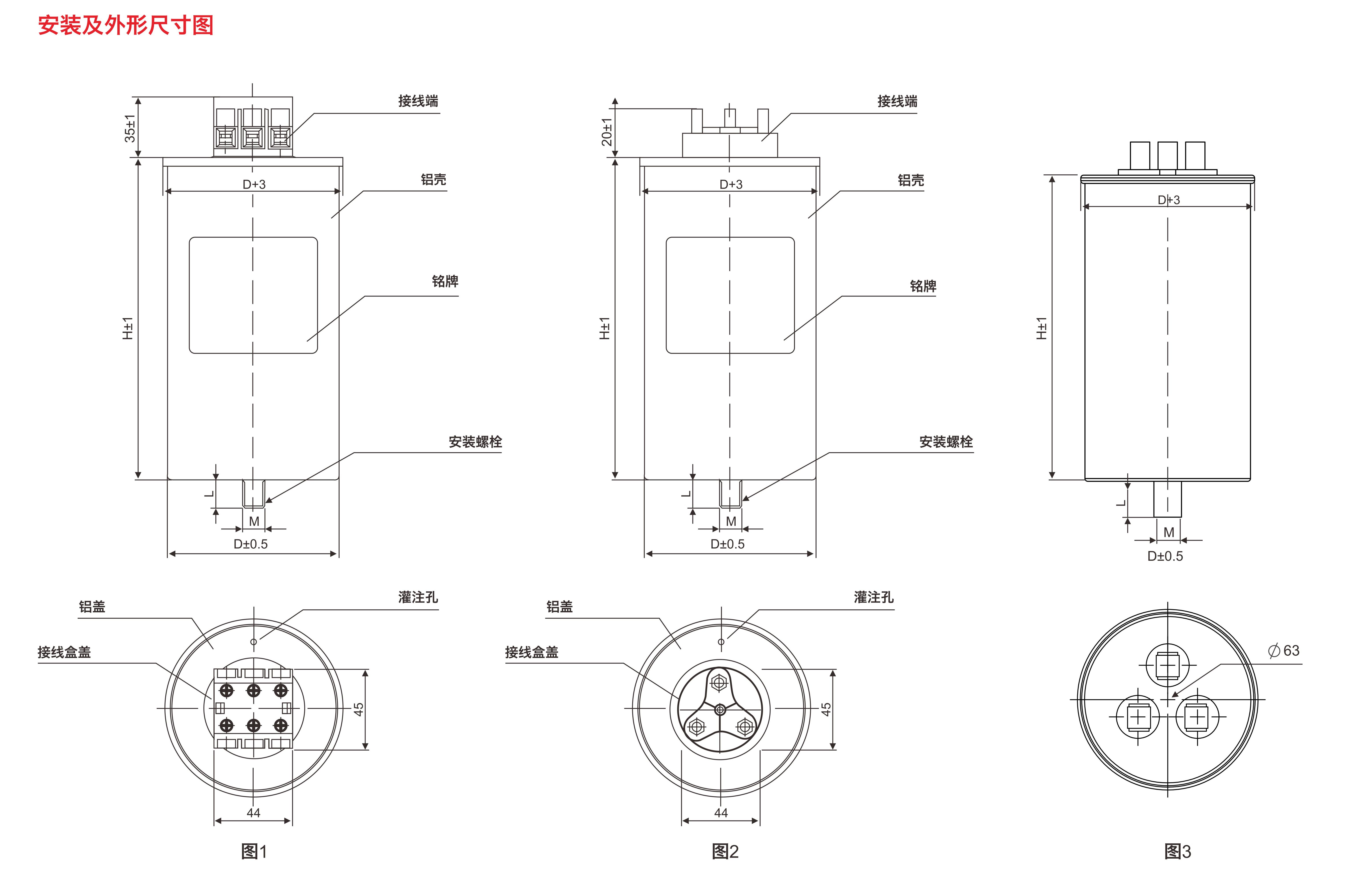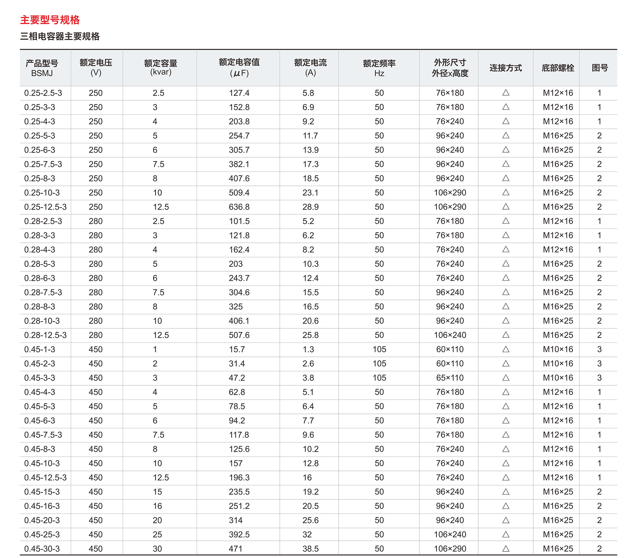 采用圓柱形鋁罐封裝。浸漬劑為無公害絕緣油。置壓力分離裝置及放電電阻。電容芯子采用自愈式優(yōu)質(zhì)金屬化聚丙烯薄膜。電容器頂部為防觸電接線端子。電容器底部為M12或M16安裝及接地螺栓。三相電容器內(nèi)部均為△接法。