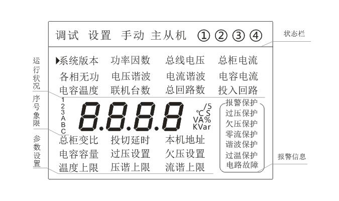 顯示屏采用 128 × 64 點陣大尺寸 LCD 屏,中文界面,實時顯示當(dāng)前時間機內(nèi)溫度,電流電壓及諧波參數(shù),通過按鍵查詢各種參數(shù)及設(shè)備運行狀態(tài),還可設(shè)置過電壓、欠電壓、欠電流、過溫度、過、欠補償?shù)雀餍袇?shù)并存儲,掉電數(shù)據(jù)不丟失;