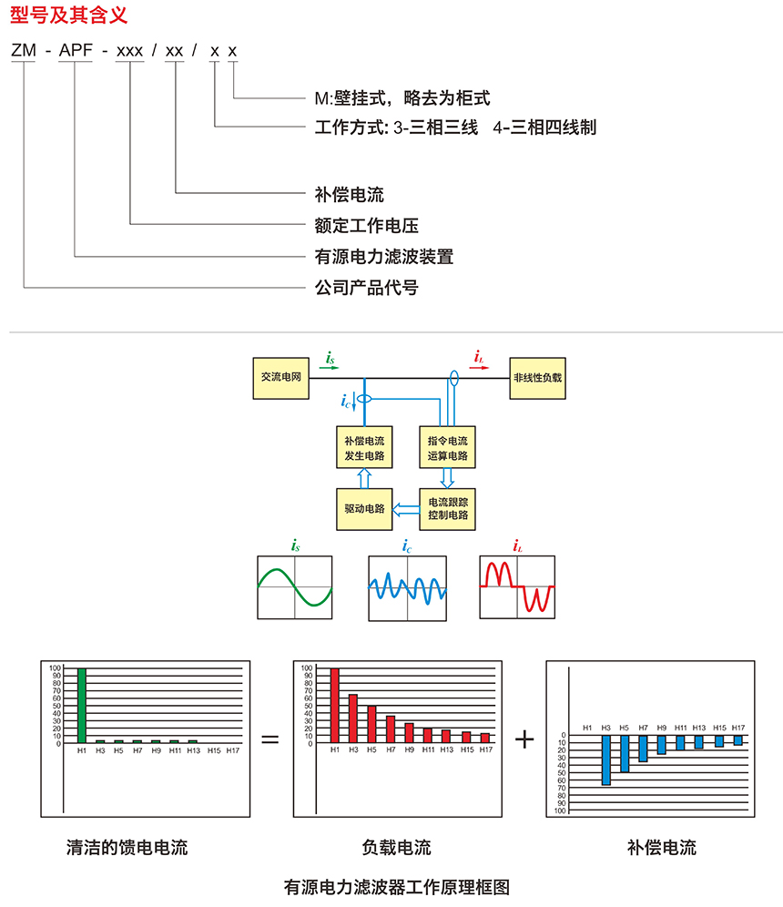 有源電力濾波器(ZM-APF), 是采用現(xiàn)代電力電子技術(shù)和基于高速DSP器件的數(shù)字信號(hào)處理技術(shù)制成的新型電力諧波治理專用設(shè)備。它由指令電流運(yùn)算電路和補(bǔ)償電流發(fā)生電路兩個(gè)主要部分組成。指令電流運(yùn)算電路實(shí)時(shí)監(jiān)視線路中的電流,并將模擬電流信號(hào)轉(zhuǎn)換為數(shù)字信號(hào),送入高速數(shù)字信號(hào)處理器(DSP),對(duì)信號(hào)進(jìn)行處理,將諧波與基波分離,并以脈寬調(diào)制(PWM)信號(hào)形式向補(bǔ)償電流發(fā)生電路送出驅(qū)動(dòng)脈沖,驅(qū)動(dòng)IGBT或IPM功率模塊,生成與電網(wǎng)諧波電流幅值相等、極性相反的補(bǔ)償電流注入電網(wǎng),對(duì)諧波電流進(jìn)行補(bǔ)償或抵消,主動(dòng)消除電力諧波。