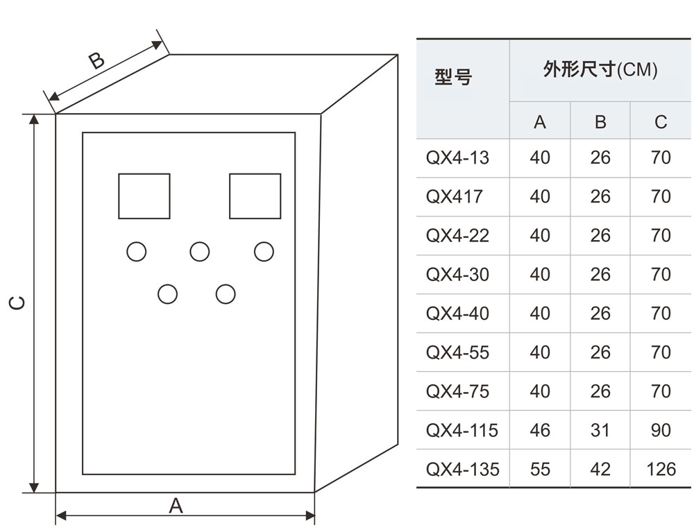 QX4系列星三角起動柜適用于三相交流50HZ/380V,功率135KW以下的三相鼠籠型電動機,用于控制電動機定子繞組由“星形”至“三角形”的換接起動,運行及停止,可實現(xiàn)對電動機的過載和斷相等保護。