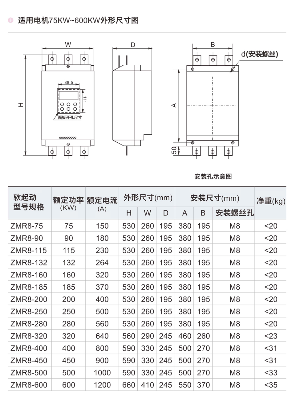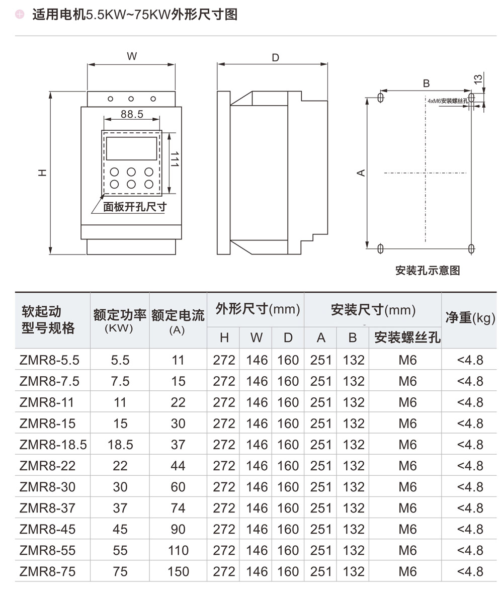 適用電機(jī):鼠籠式三相異步電動(dòng)機(jī),電機(jī)額定功率應(yīng)與軟起動(dòng)柜額定功率相符或以下。