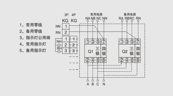 接線時,常用電源N應(yīng)接入常用電源執(zhí)行斷路器QN.備用電源R應(yīng)接入備用電源執(zhí)行斷路器QR。當QN和QR為四線斷路器時,接線方式按接線圖,其中QN和QR的1、3、5為三相(A、B、C)進線端,2、4、6為三相出線端,7為零線(N)進線端.8為零線出線端。若選用斷路器為三極斷路器,則必須將常用電源(N)的零線NN和備用電源(R)的零線NR同時接到三極專用接零線端子KG上。具體操作見接線圖。雙電源切換開關(guān)自動控制器的工作電源取斷路器QN和QR的進線端A相和零線N,若選用斷路器為三極斷路器時,必須要接零線NN和NR,該三極專用接線零端子在兩臺斷路器中間,在自動電源切換開關(guān)安裝,接線過程中,切不要把原接在斷路器進線端的本機控制器線忘掉,碰斷或短路等。